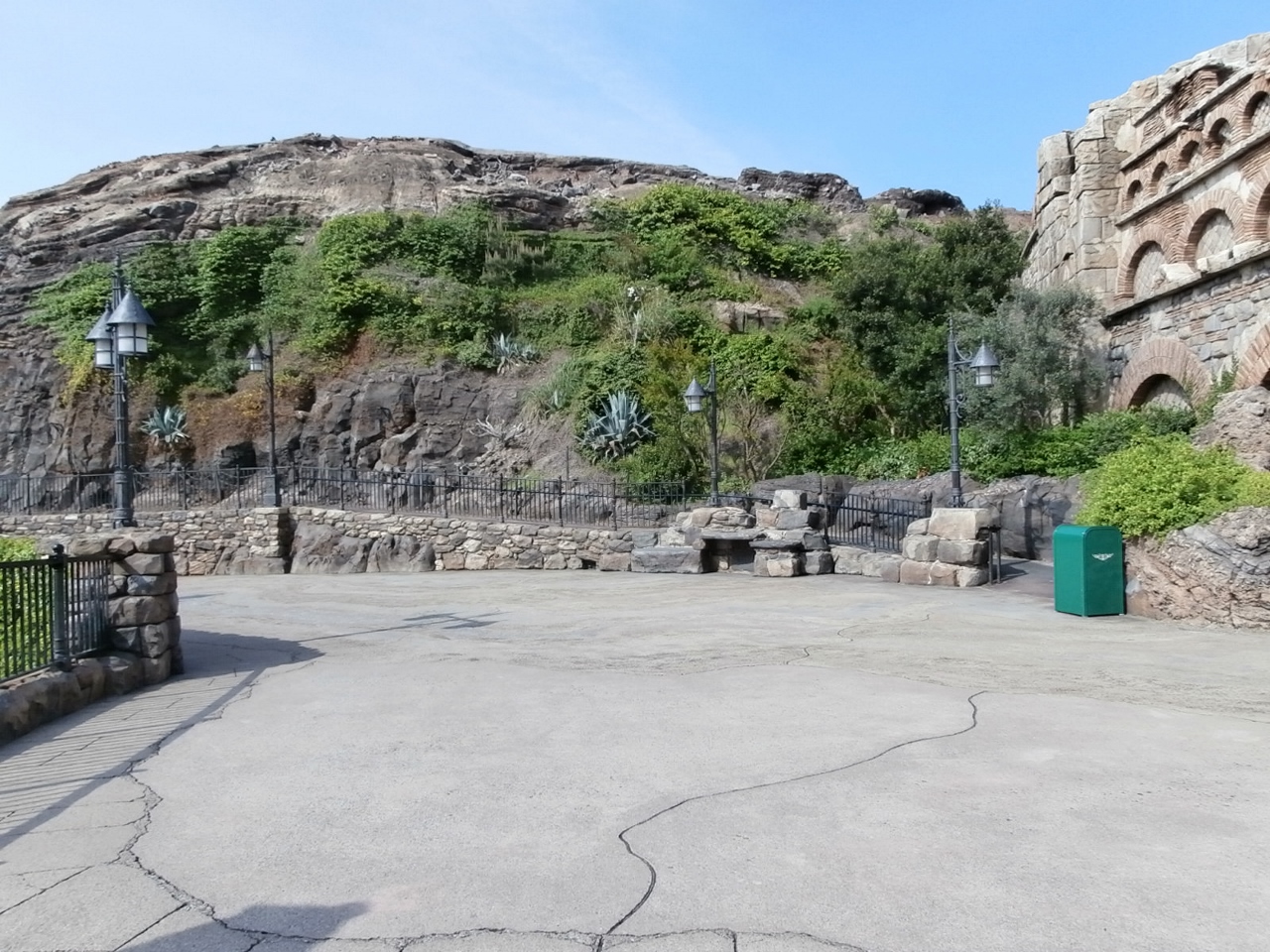 ここが、水道橋(アクアダクト)の先の待機ラインです。正面左側には、ミステリアスアイランドに続く洞窟の入り口があります。センターやインディを目指すゲストはここで待機して開園を待ちます。