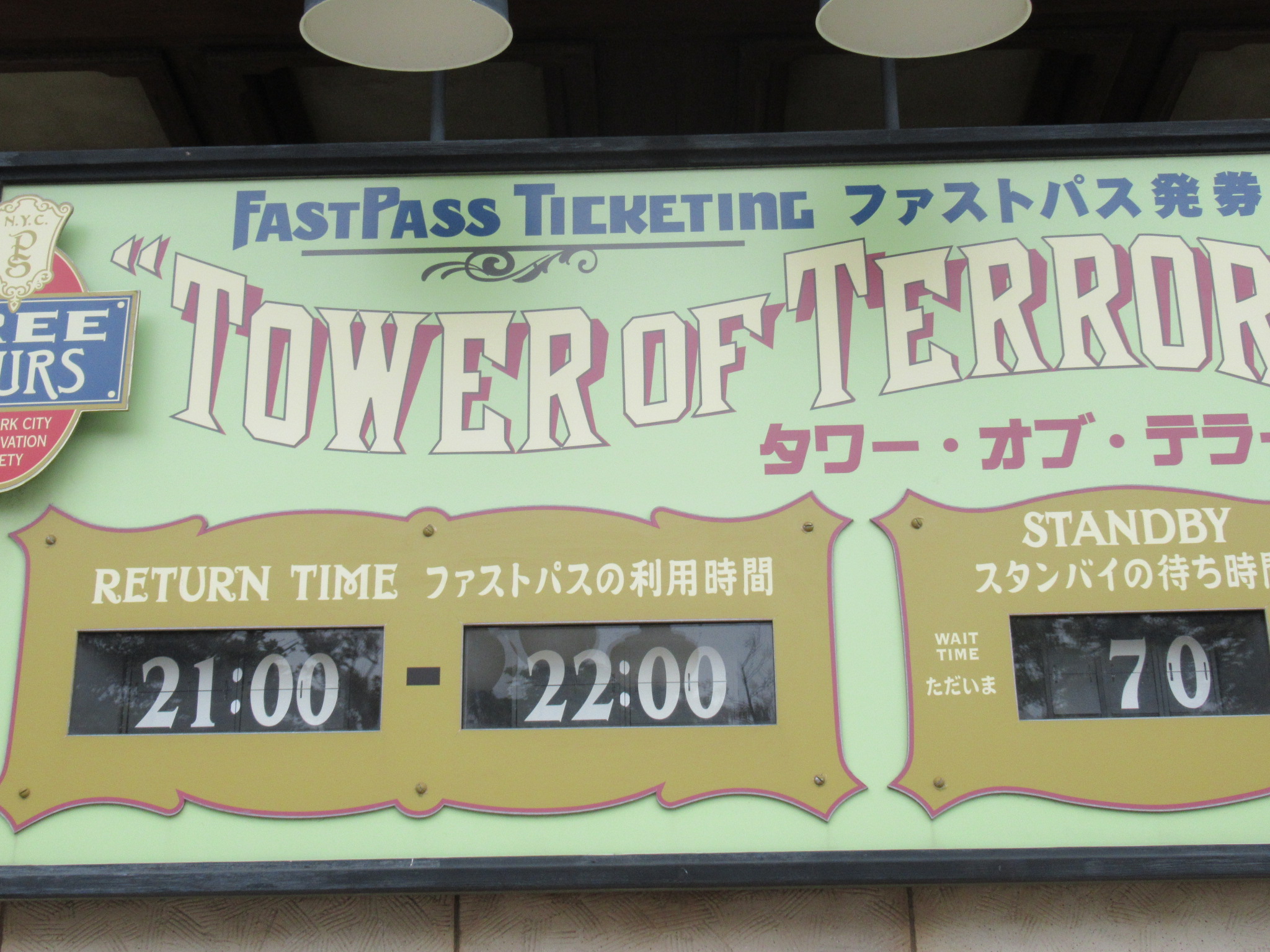 タワーのFPが、15時まで残っている=空いている日、です。スタンバイ70分は、タワーでは、ちょっと混んでいる程度の待ち時間ですね。