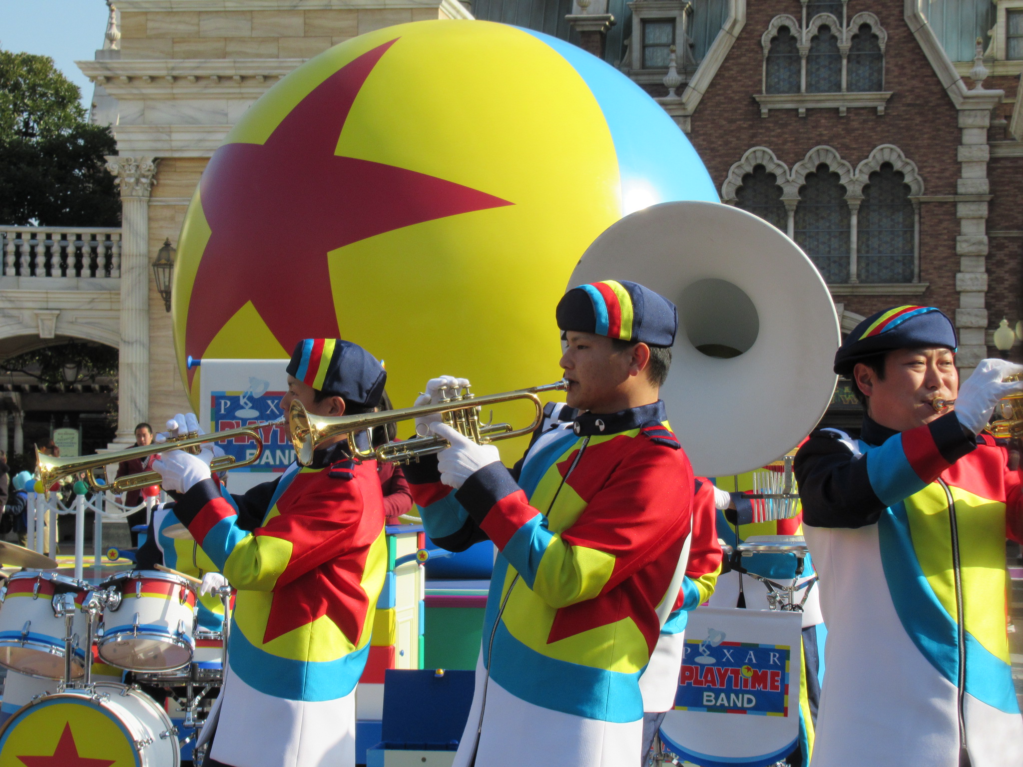 いつもは、クラシックな白いテールコート姿のバンドメンバーも、イベント期間は、カラフルなピクサー風のコスで登場です。