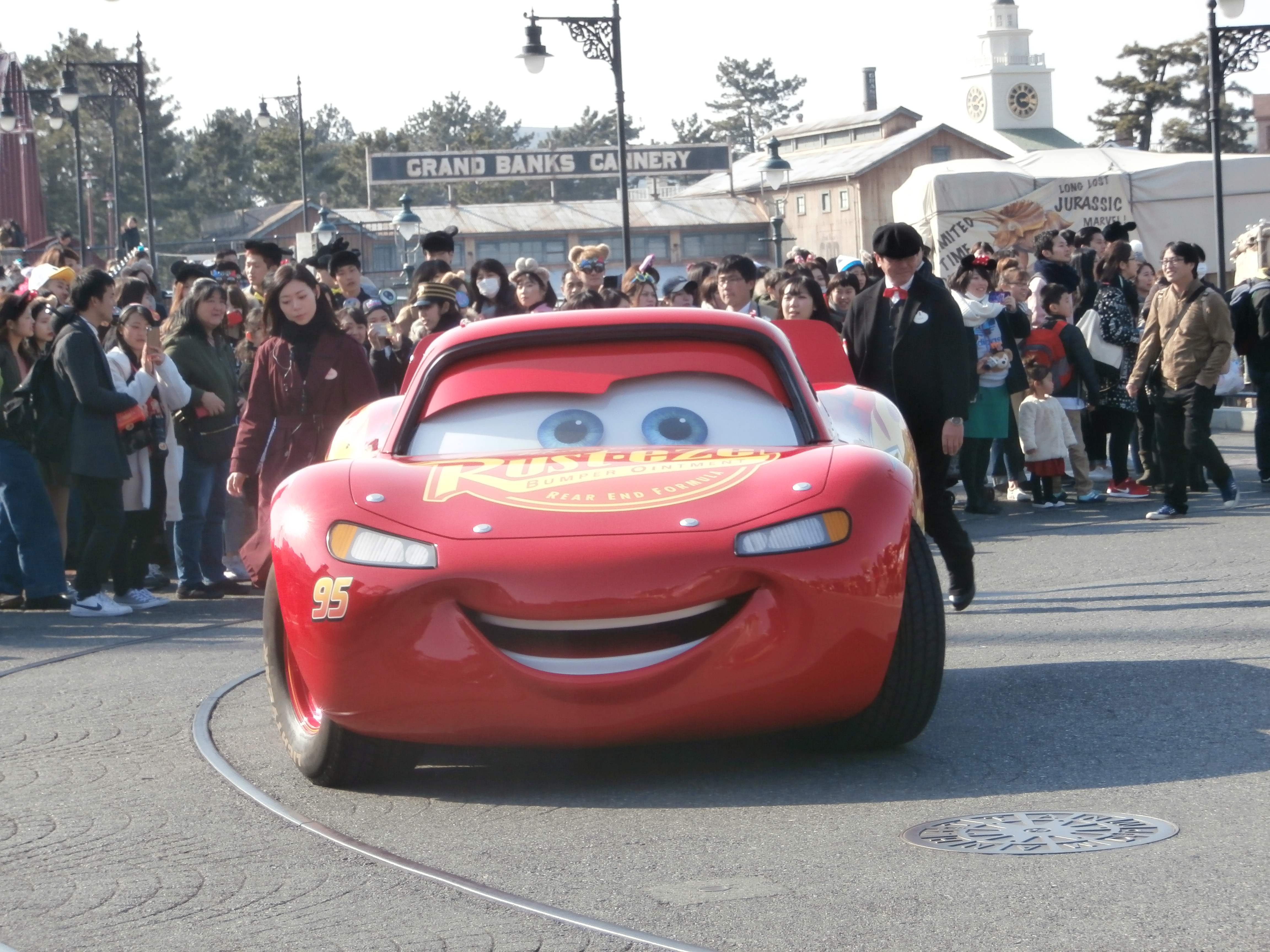 3つ目のエンターテイメントは、ご存じ、「カーズ」の主人公、レーシングカーの、ライトニング・マックィーンが主役のパレード、