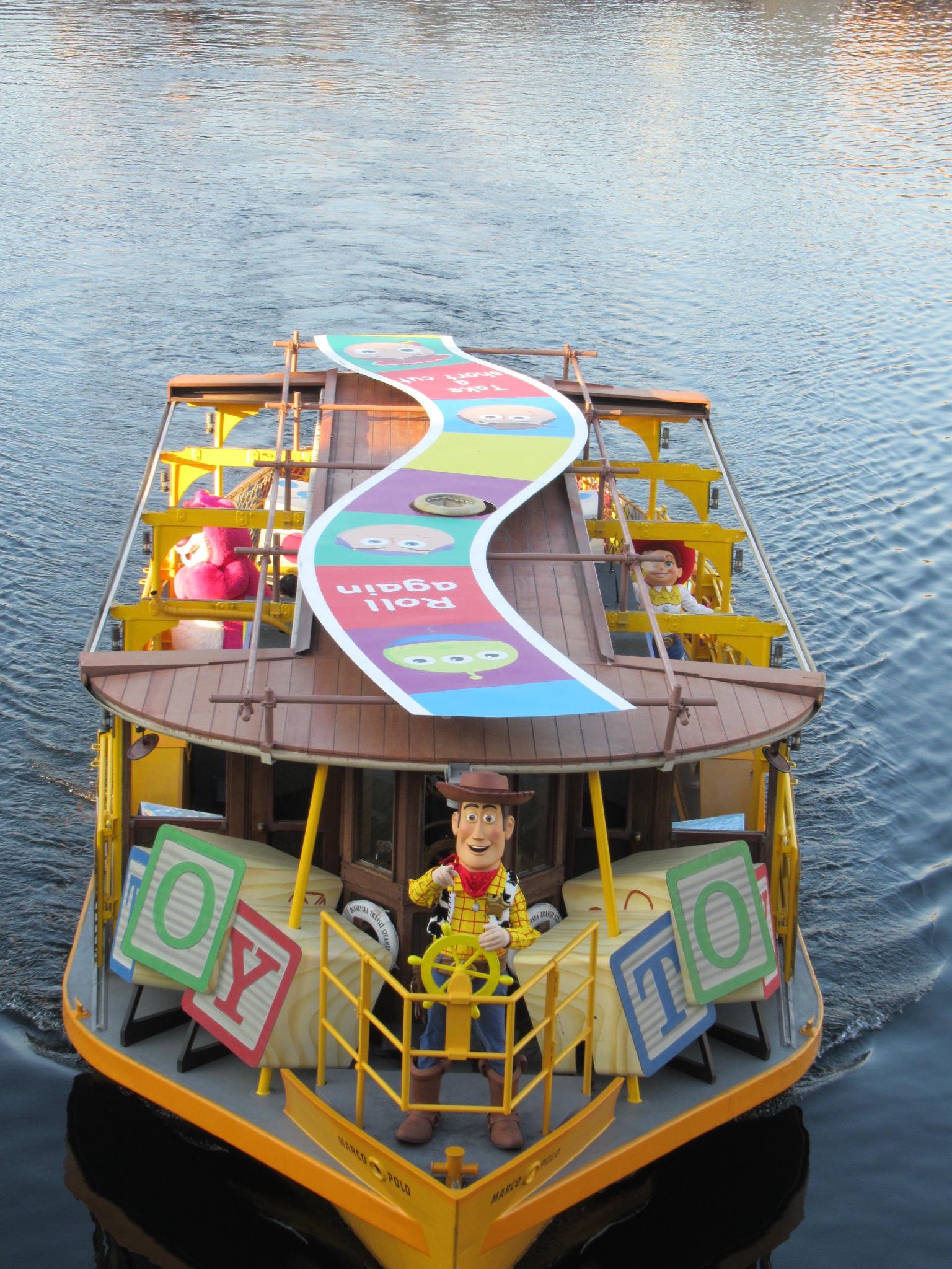 スチーマー船は、2隻1組。1隻目は、先頭にウッディ、バズ、ジェシー、ロッツォ。2隻目は、先頭にマイク、サリーが乗船しています。