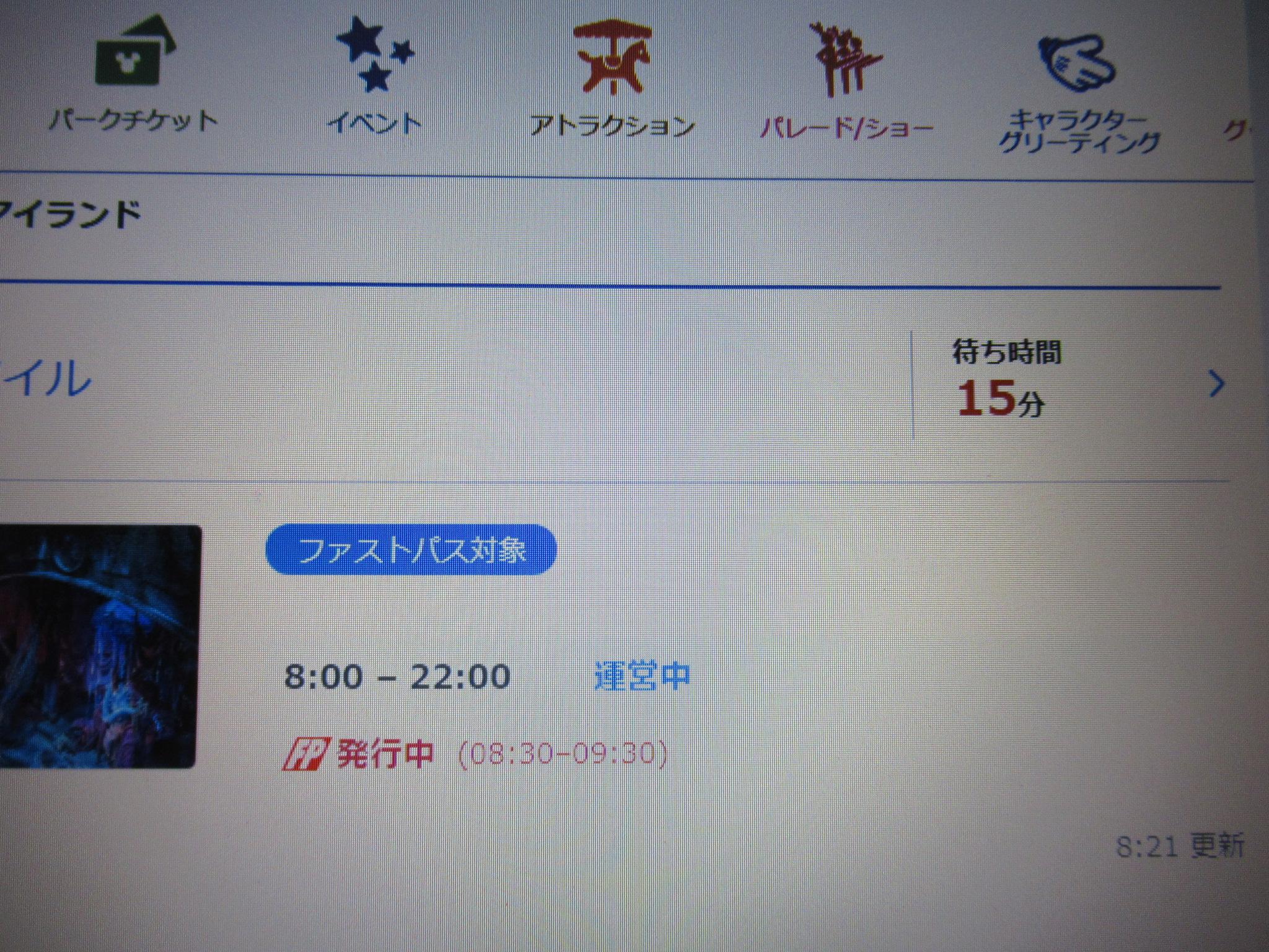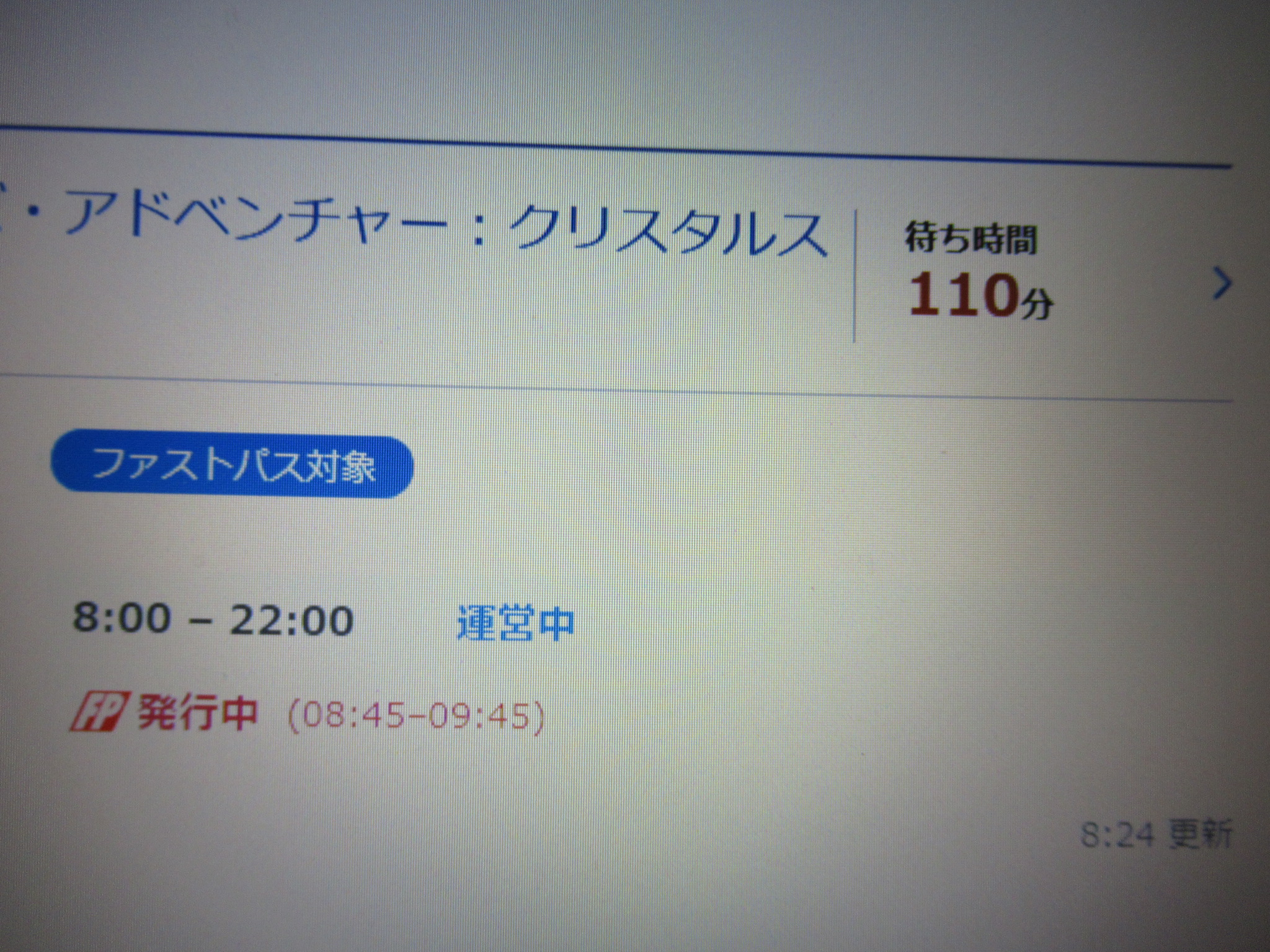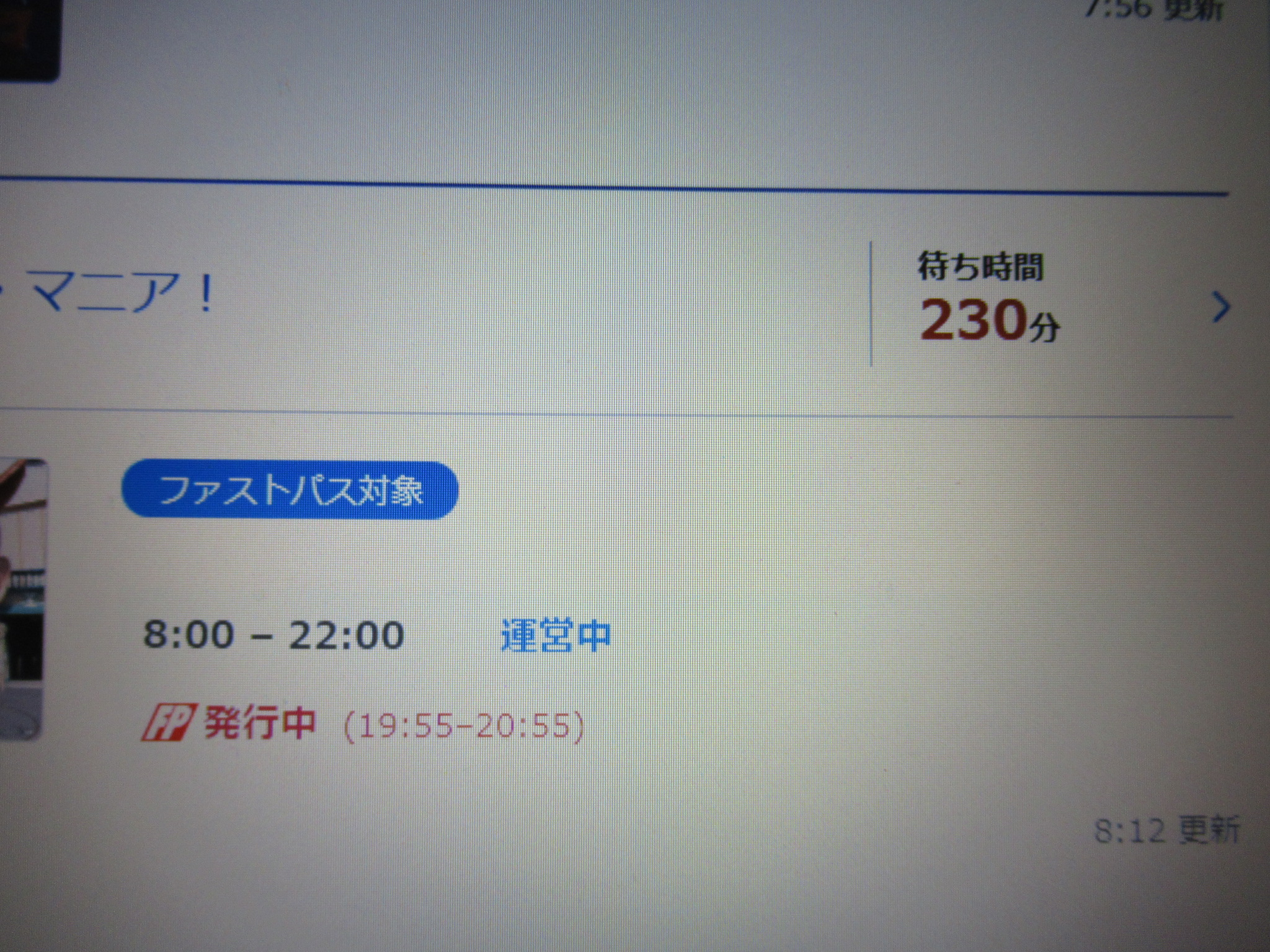 この後、10時30分頃に、運行を再開。スタンバイは、一気に170分まで伸び、その時点のFPの乗車時間は、21時35分~22時になっていました。