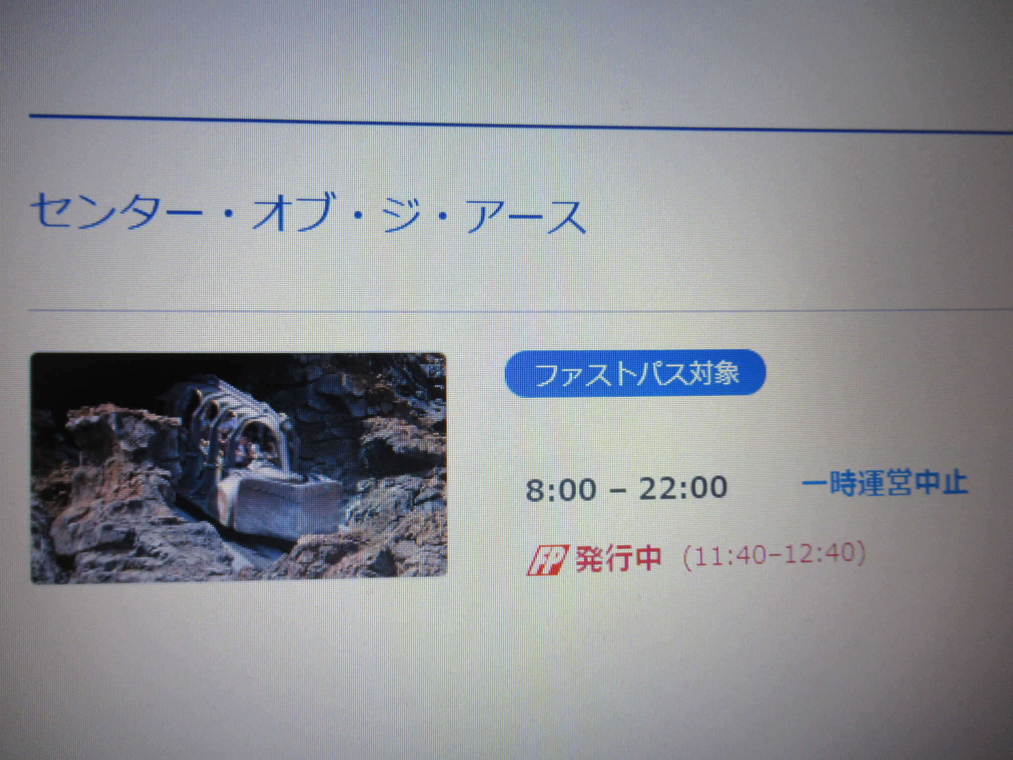 FPの乗車時間は、開園20分ほどで、早くも11時40分~12時40分。FPを取ったはいいけど、しょっぱなから2時間縛りでは、発券した意味がないなぁ。インディやタワーのFPを発券すれば、次のFPが、1時間以下で取れるのに・・・