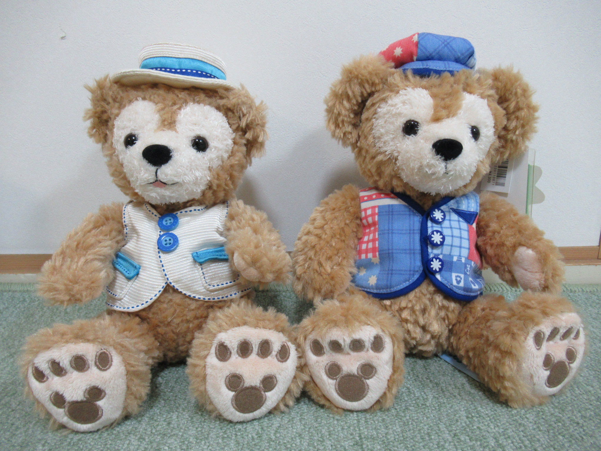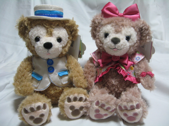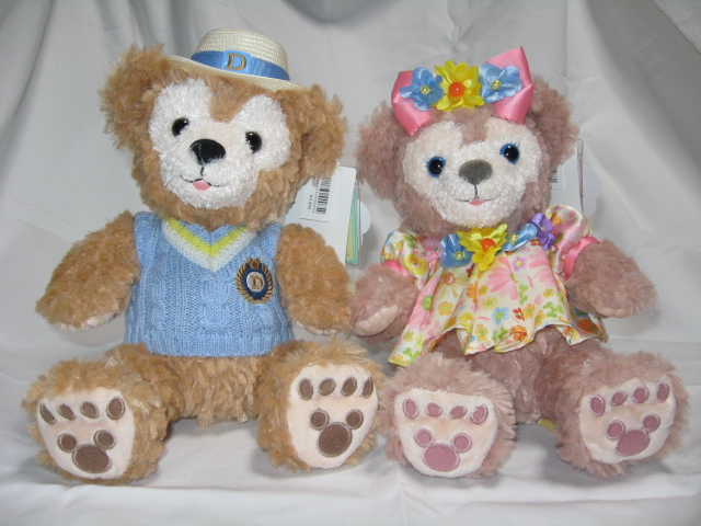 これがSSサイズのぬいぐるみです。右側はダッフィーのお友達のシェリーメイ。どちらもスプリングヴォヤッジ限定のコスチュームを着ています。各3,800円