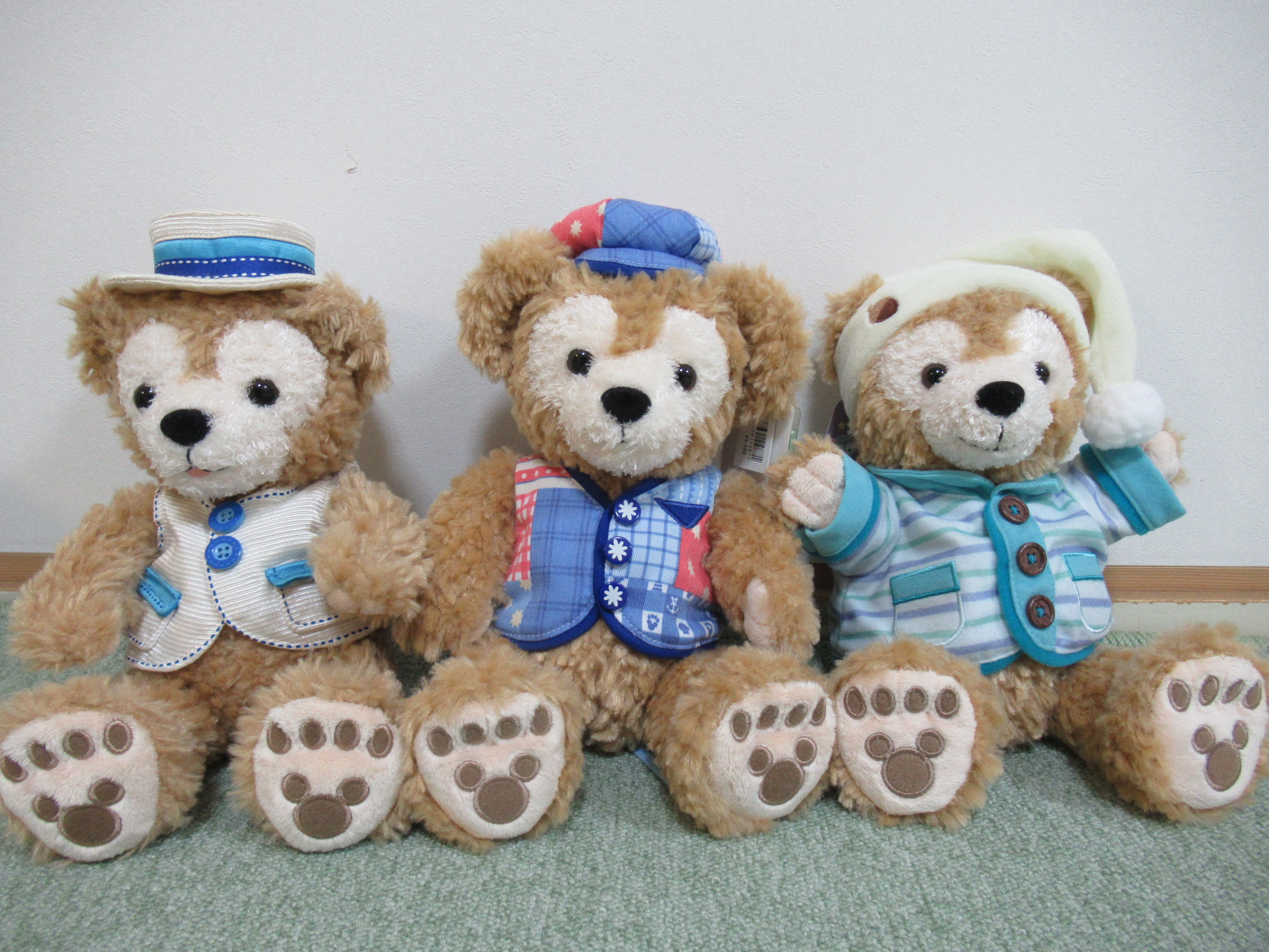 左から、スプリングヴォヤッジ2012のSSちゃん、シー15周年のSSちゃん、2018年秋に開催された、ダッフィーの秋のグッズライン「オータム・スリーピングオーバー」の、パジャマを着用したダッフィーのハンドパペットです。