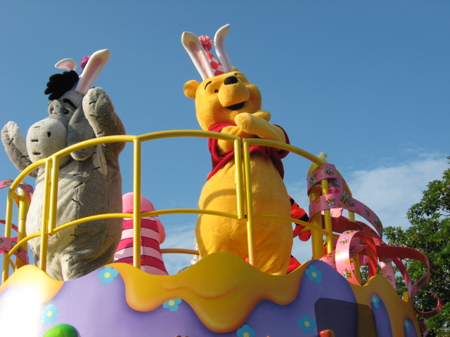 あら懐かしい、「イースターワンダーランド」のプーさんフロート。ウサギのように飛び跳ねるバニハハダンスに、ぽっちゃり系のプーさん、ちょっと追いつけな~い!
