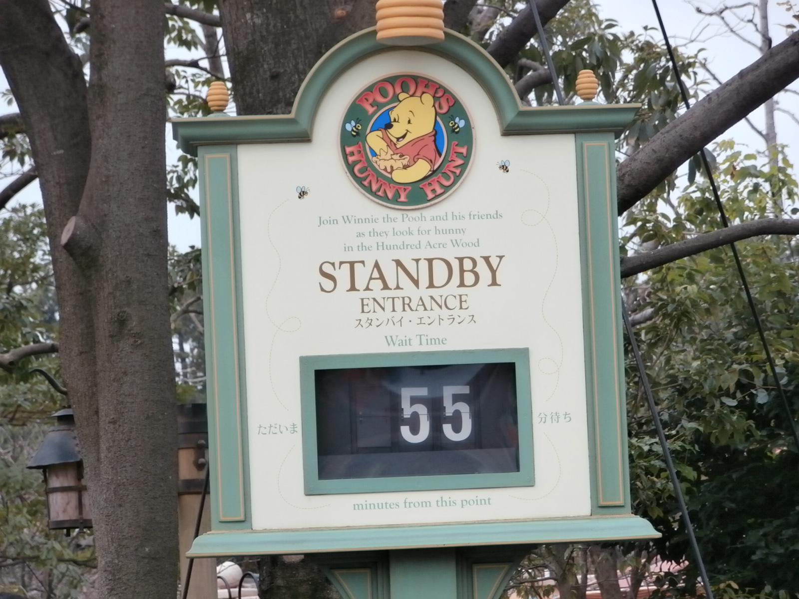ハニハンの入り口にあるスタンバイ時間の表示版。ハニハンは小さいお子さんから大人まで人気のアトラクションなので、平日でもスタンバイ40~60分は当たり前です。