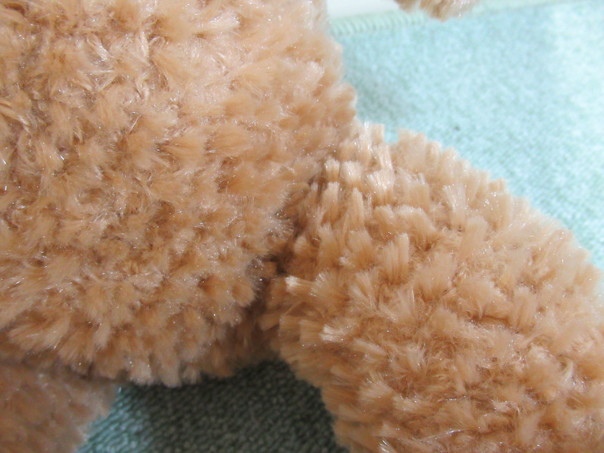 ダッフィーのぬいぐるみの生地は、ふわふわ感を出すために、長めの毛の間に短か目の毛を密集させた織り方になっています。この生地はダッフィーのぬいぐるみ専用の特注品で、市販はされていません。
