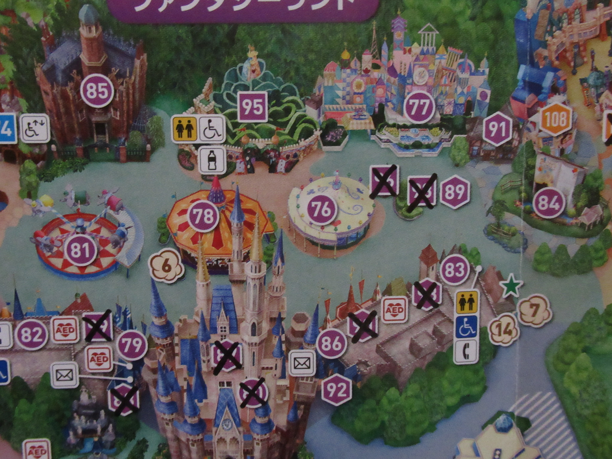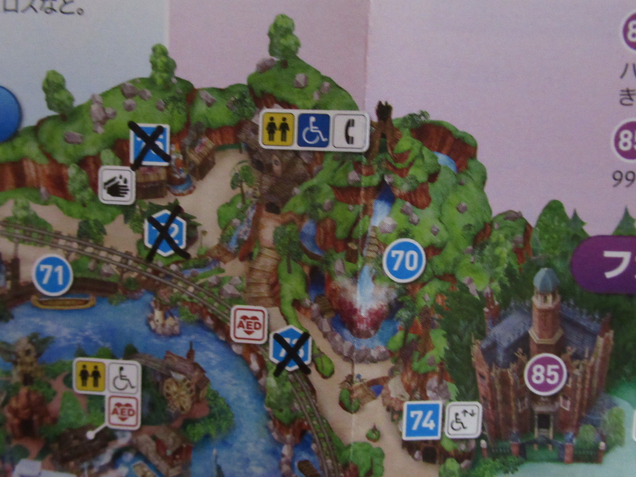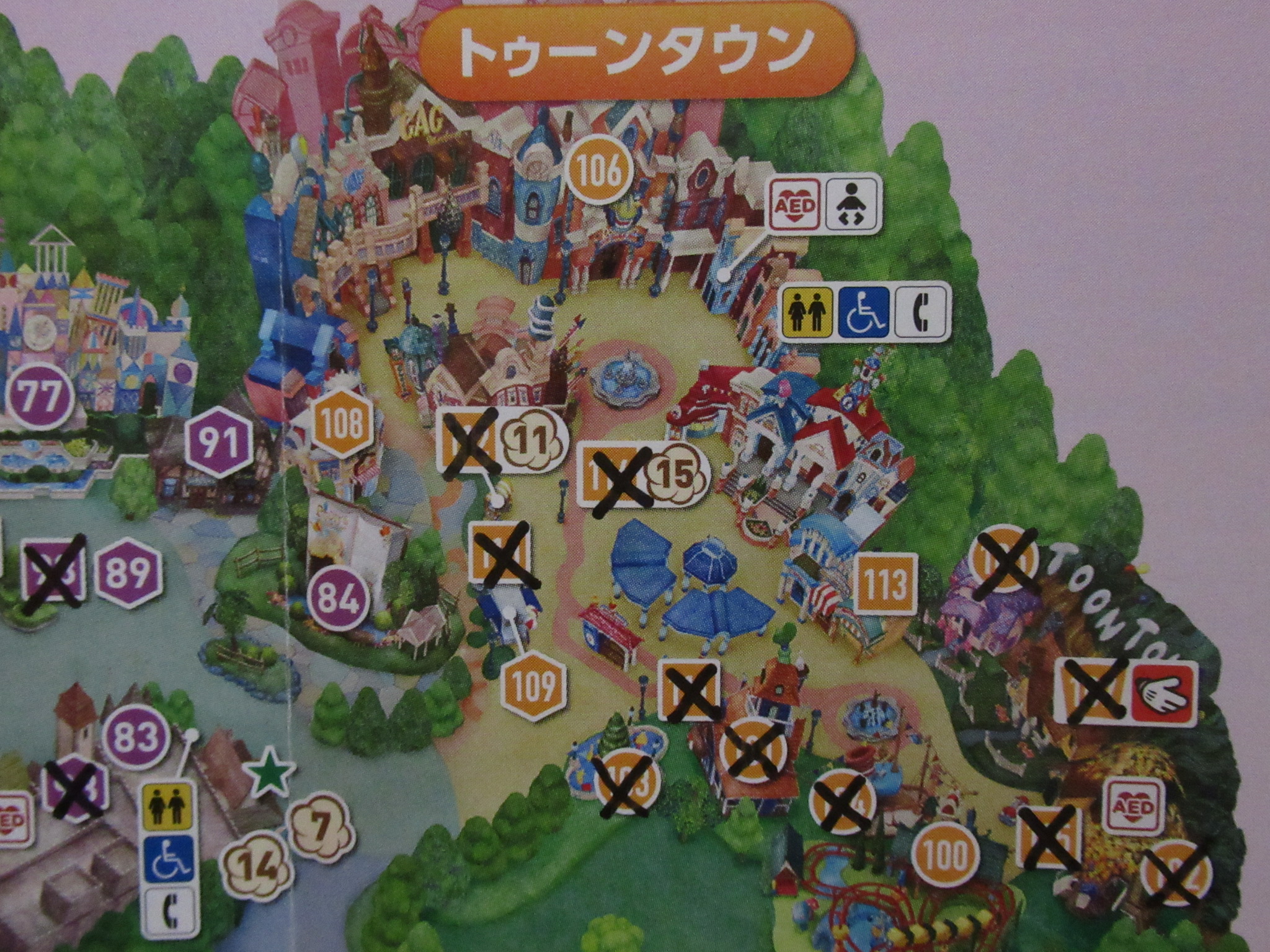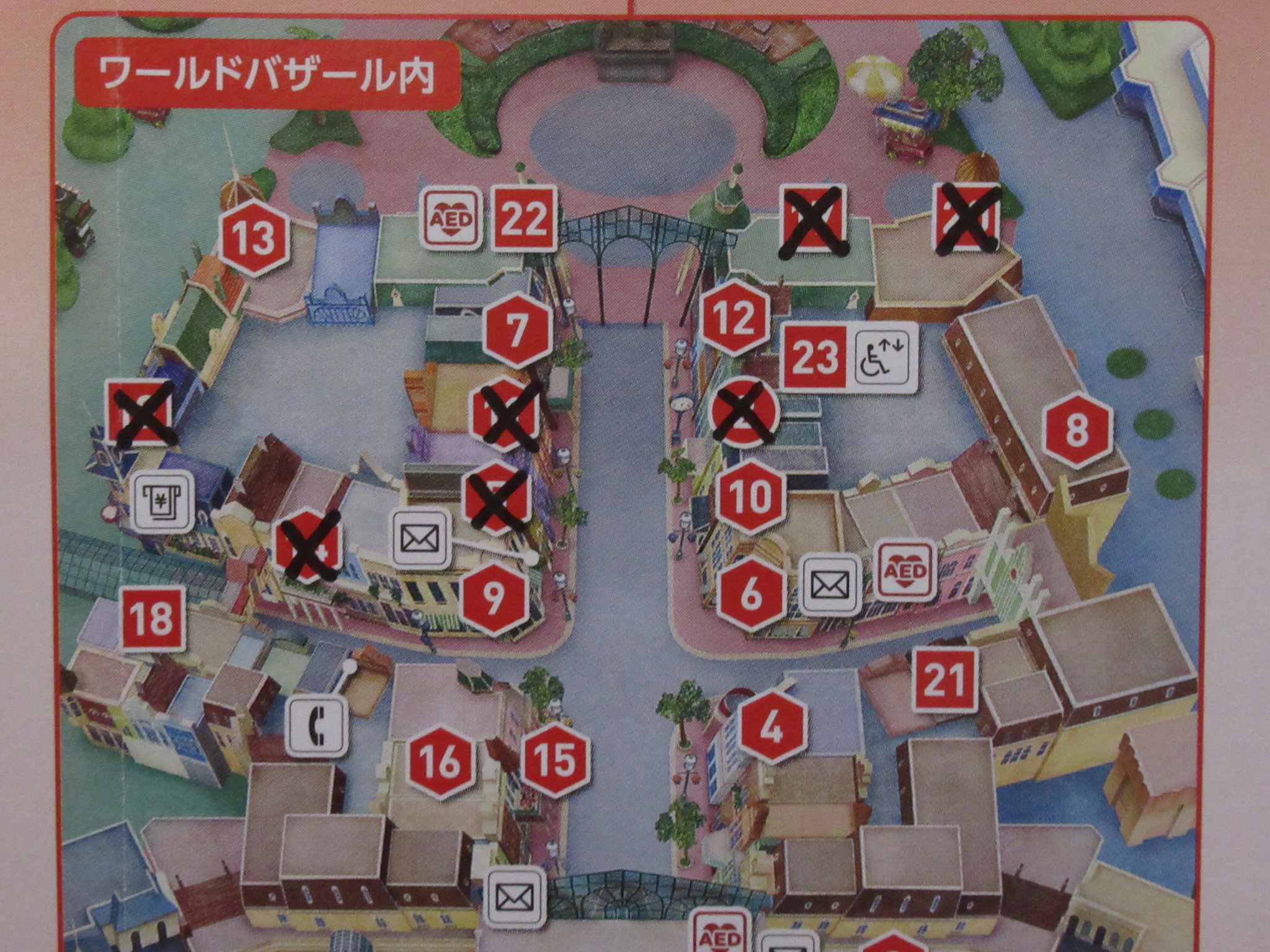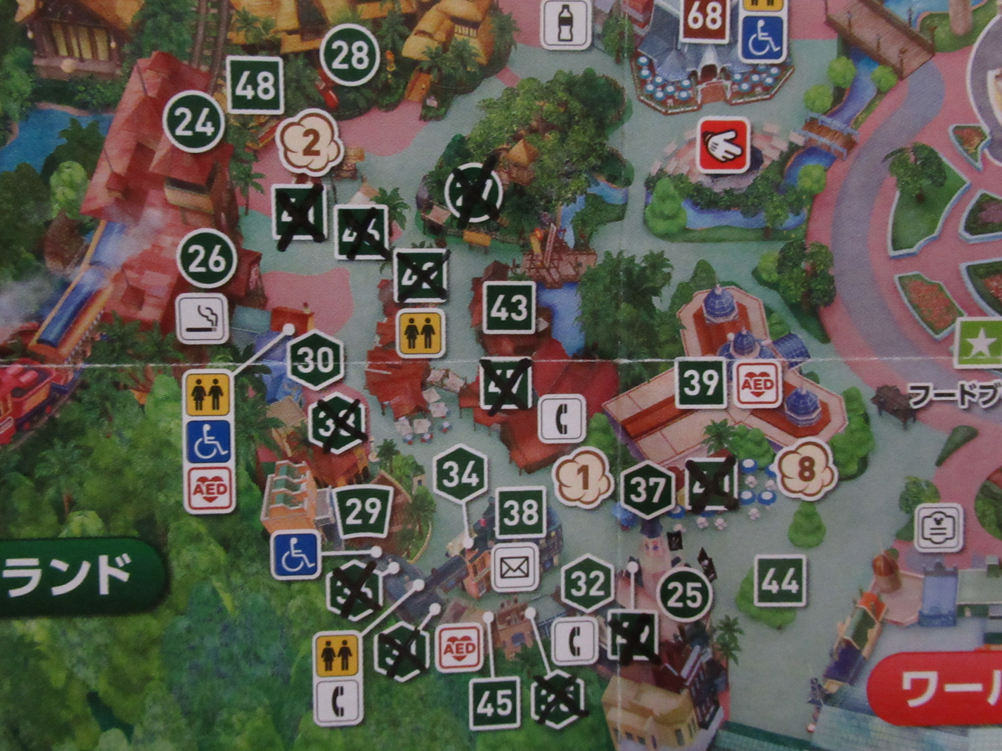 うわ~、ごちゃごちゃして見にくいなぁ。アドベンチャーランドは、狭いエリアに小規模な店が密集しているので、こんな感じになっちゃいます。ぱっと見は、4割くらいの施設が休止していますね。
