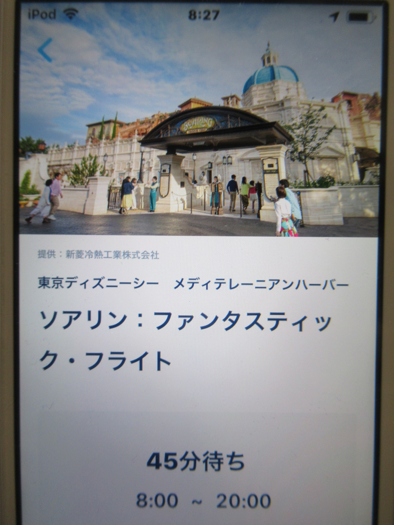 7月2日の8時27分のソアリンの状況。入園者数が少ないのに45分待ち? やはりソアリンの人気はすごいですね~