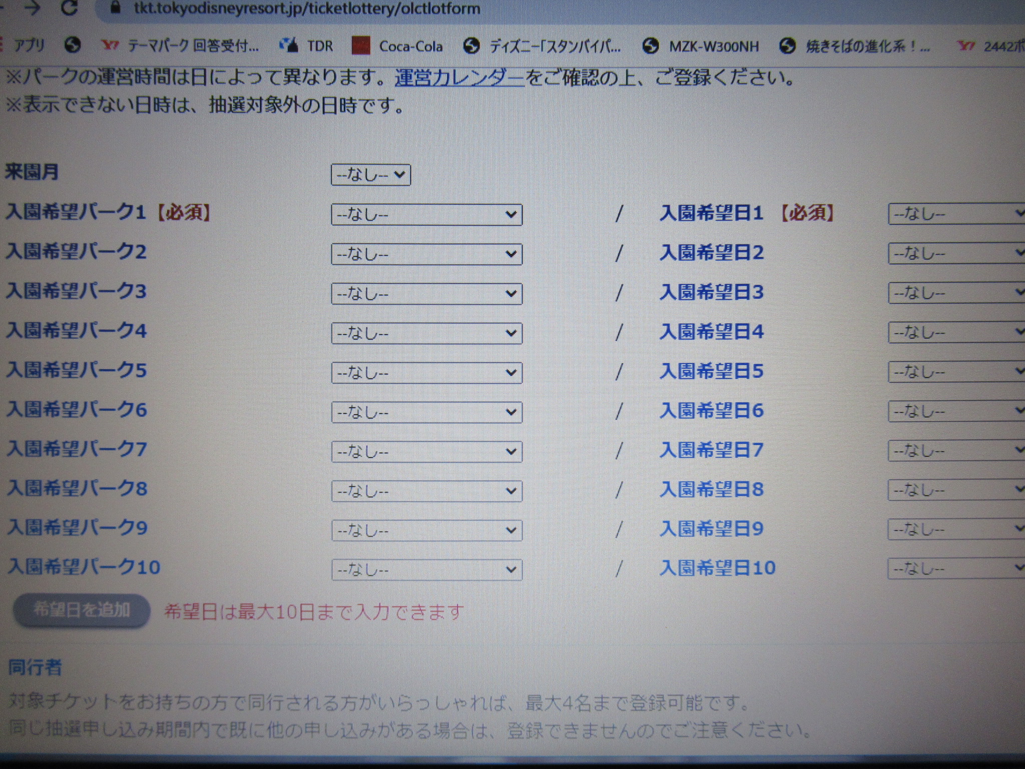 お客様情報として、まず氏名、チケット番号、メールアドレスを入力。その次に入園希望パーク、希望日を入力します。希望日は最大10日分まで登録できます。もちろん、1日だけ、2日だけでもOK。