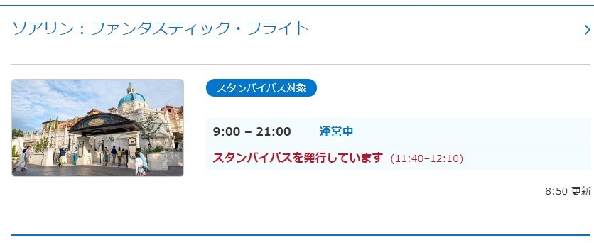 更新時間は8時50分。アーリーエントリーだけでなく、一般入園のゲストもスタンバイパスをすでに発券しているので、こんな時間になっています。