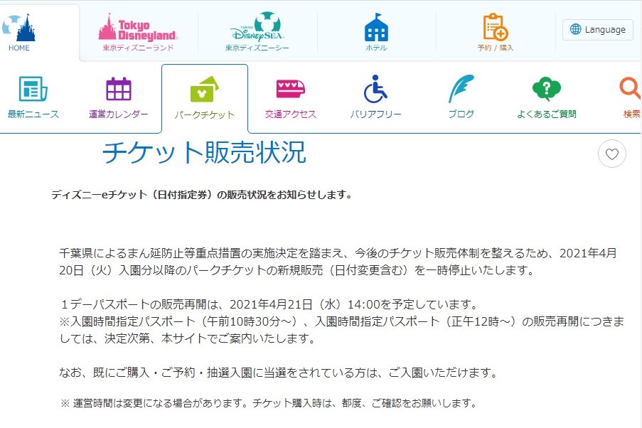4月20日のまん防適用を受けて、ディズニーは4月19日に公式にまん防実施期間のパーク側の営業について発表しました。