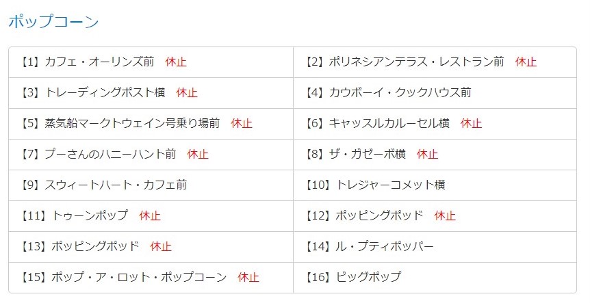 ぱっと見ただけでも「休止」の文字が目立ちますね。ランドは16か所のうち6か所、シーは10か所のうち4か所しか営業していません。今、ポップコーンが買えるところって、そんなに少ないの⁉って、ちょっとがっかりするような数字ですよね。