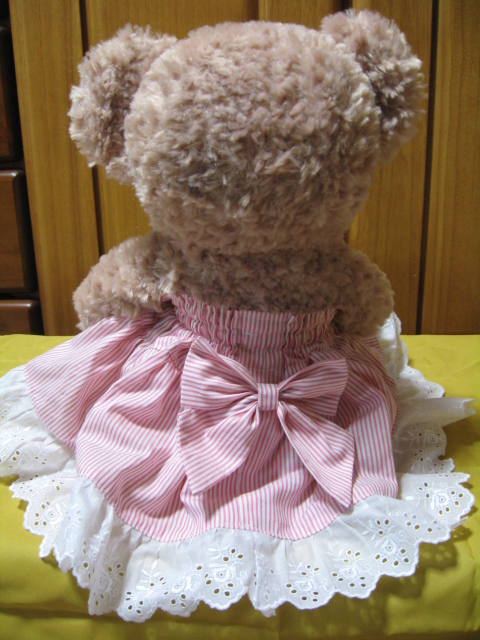 バックスタイルは、こんな感じ。肩ひもを後ろ中央でそろえてV字にしてみました。肩紐を付ける位置は、ドレスをシェリーメイに着せて、肩ひもを差し込んで好みの位置を決めてから、手でまつりつけてください。