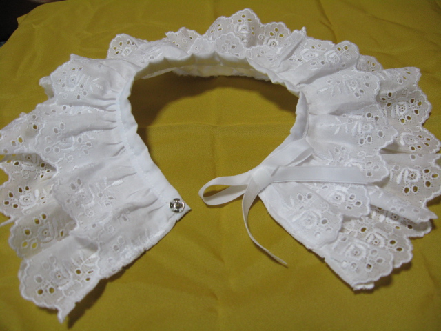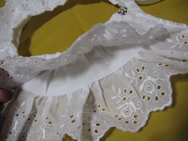 こちらが完成品です。レースを2段に重ね、シェリーメイの首のサイズに合わせてギャザーを寄せてからA布でくるみます。