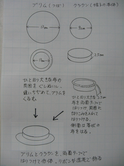 こちらが、帽子の型紙と作り方です。厚紙で円筒形と丸い板を作り、布を張り付けてから2つを合体させて帽子の形にします。