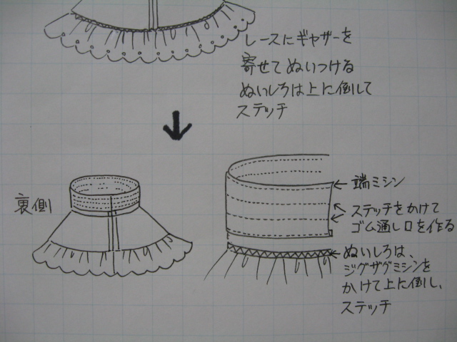 画像では、ドレス本体の胸部分の縫い方、レー製の襟、後でご紹介する肩紐それぞれの作り方が1枚にまとまっています。