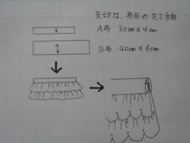 ②B布にレースを重ねて2枚一緒にギャザーを寄せて、A布に縫い付ける