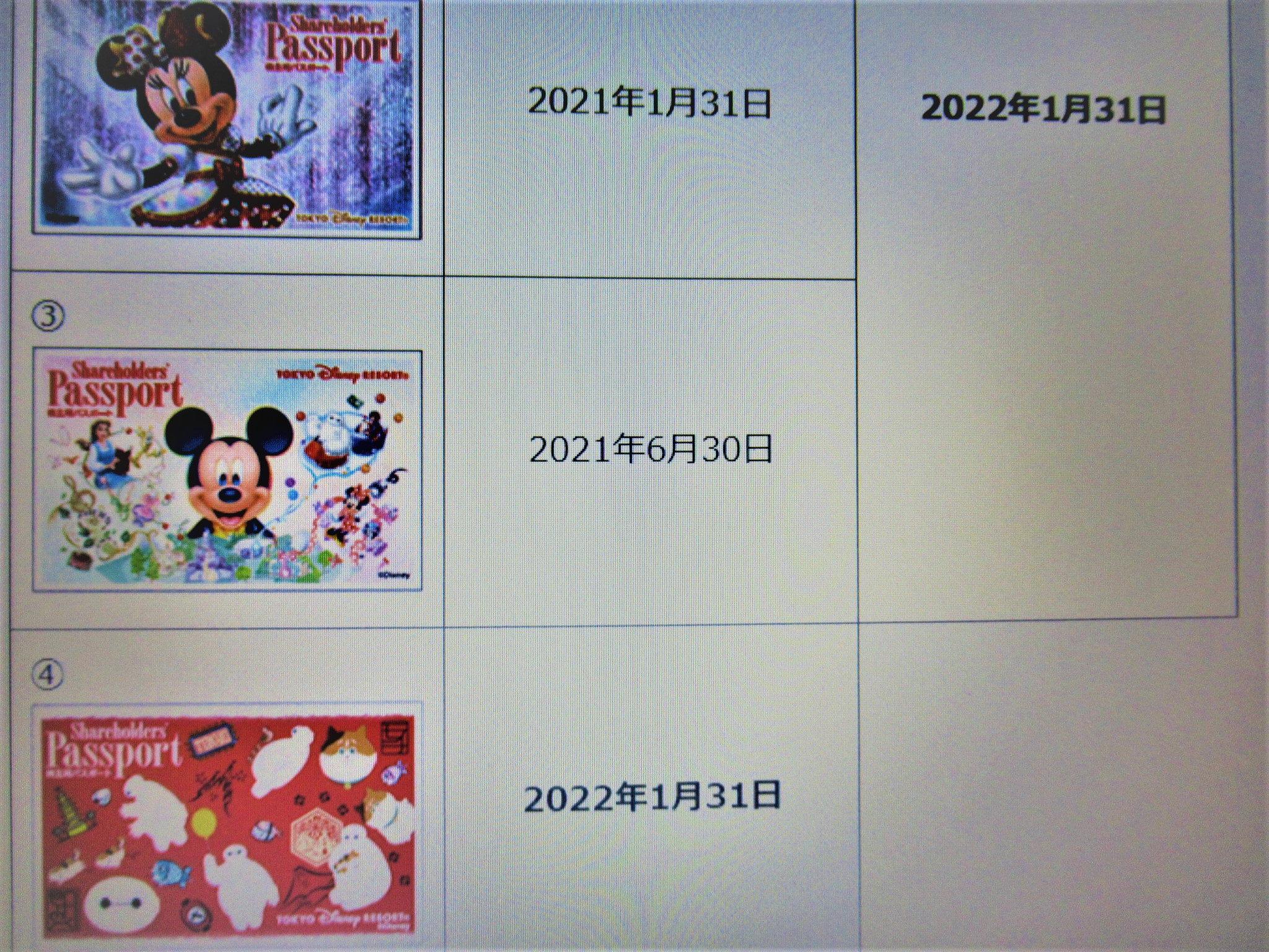 以上の4枚の株主優待券は、全て利用期限が2022年1月31日までとなっています。2021年6月に開催されたオリエンタルランドの株主総会で配布された資料にも、コロナ禍で使用できない株主優待券についての記述があるのですが、そこには写真付きで「これらの絵柄の株主優待券の再度の利用期限延長はありません。」ときっぱりはっきり書かれています。