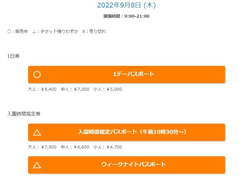 こちらは、2022年8月27日(土)現在のシーのeチケの在庫状況。あれ、1ディが余裕で残っていますね。でも10時30分入園や17時から入園のウィークナイトパスポートが△に? これって、リーナ・ベルのグッズは買いたいけど、チケット代は節約したいなと思うファンが多いからかな?